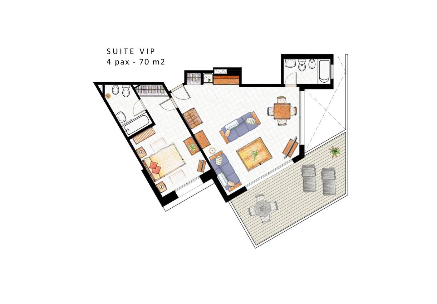 Deluxe Family Suite. This spacious apartment has a main bedroom with a queen-size bed and a bathroom. It features a comfortable seating area with 2 sofa beds and a cable TV. The unit includes a coffee machine, a microwave, a refrigerator and an additional toilette. The full bathroom is completed with a bathtub, a shower and a hairdryer. The apartment boasts air conditioning, a safety deposit box and a balcony with views of the sea. Subject to confirmation based on availability. ;